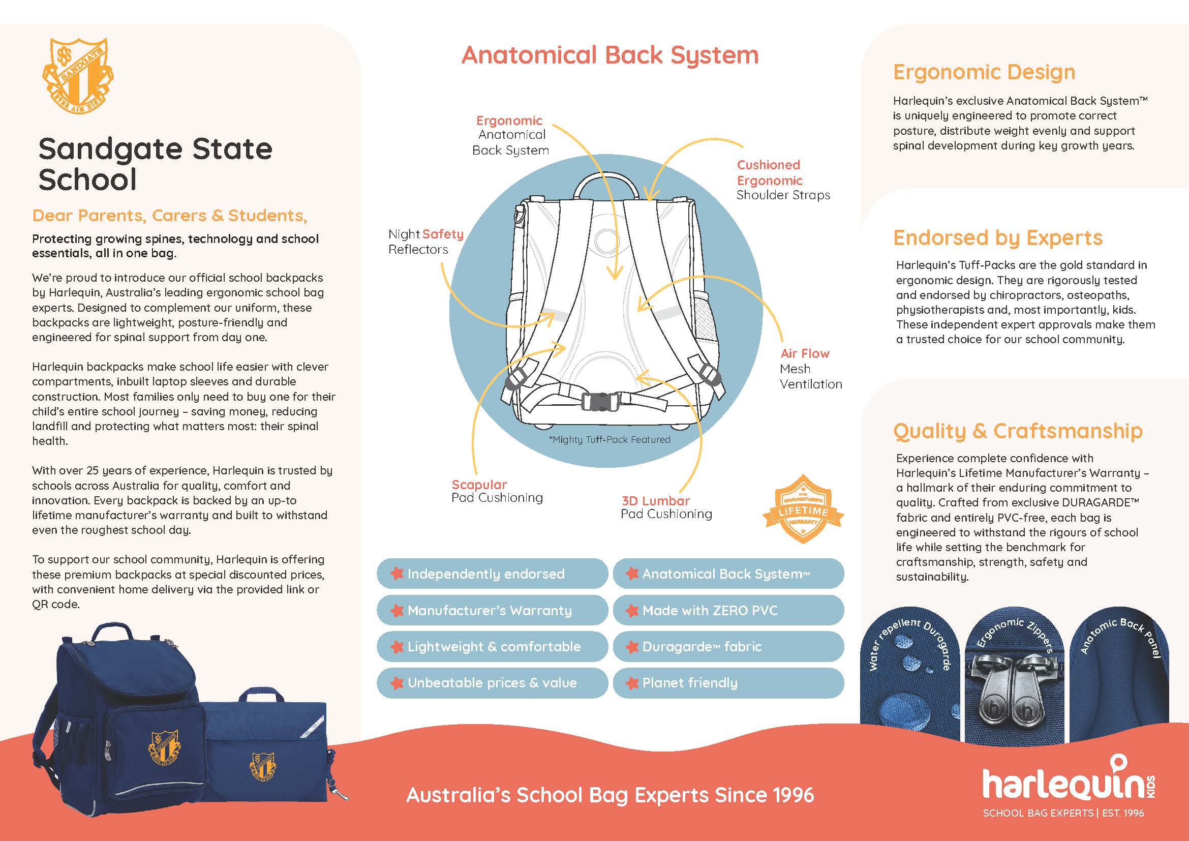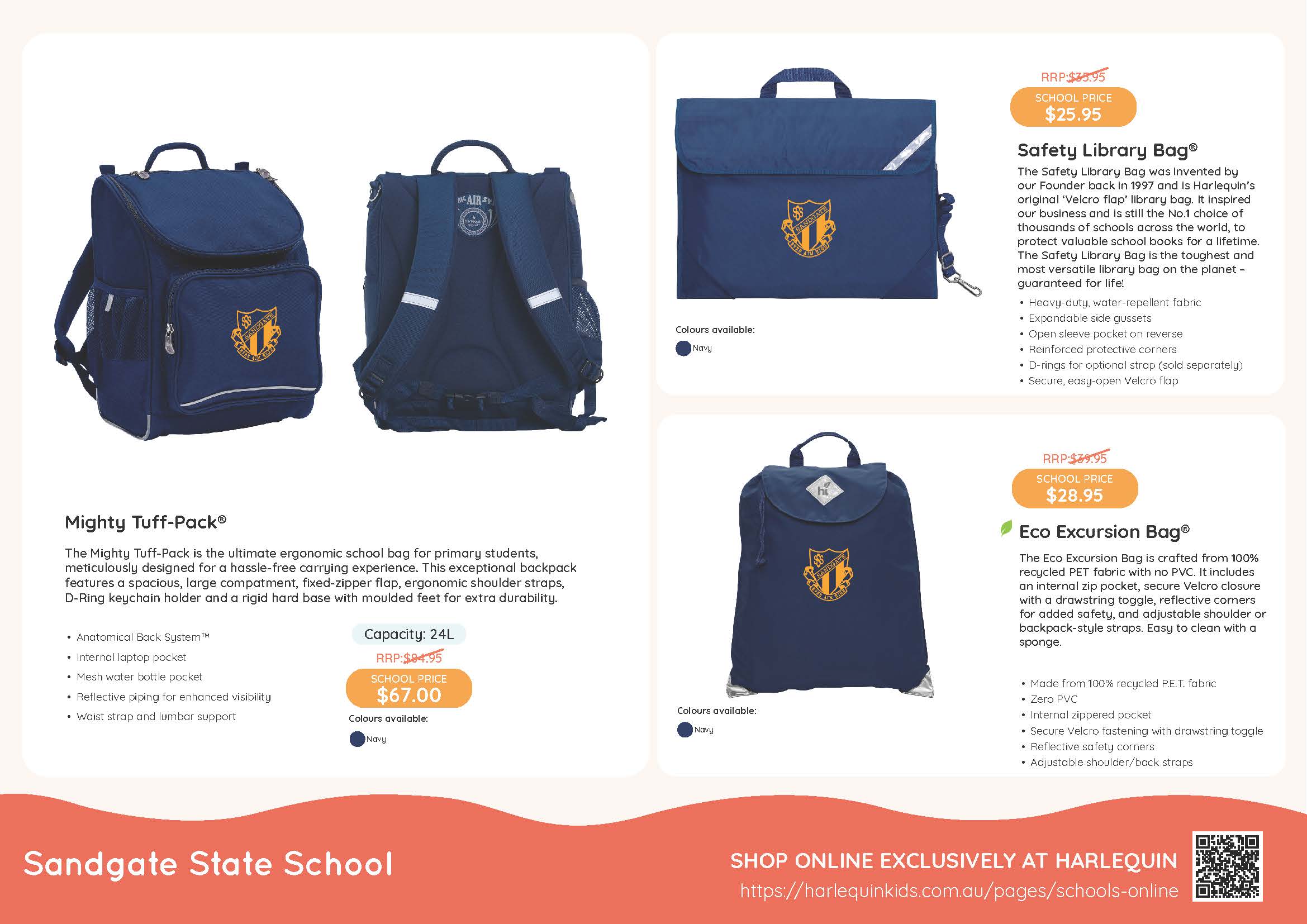 School Branded bags, library bags & exursion/swim bags are still available for families direct from Harlequinn Kids website for delivery to your home.